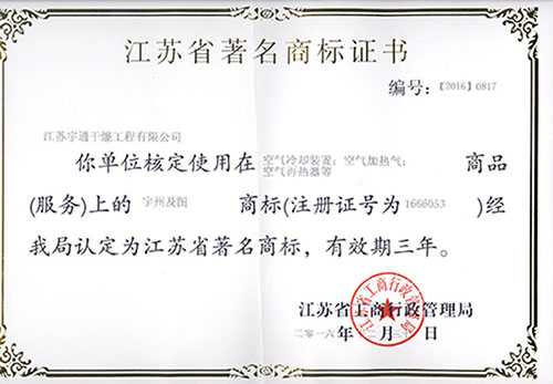 日前,江苏宇通干燥工程有限公司商标“宇州(yuzhou)”被江苏省工商行政管理局评为“江苏省商标”,并由常州市天宁区工商行政管理局的工作人员亲自将“江苏省商标”荣誉证书和荣誉牌匾送到公司。这是宇通干燥2016年荣获“常州市知名商标”以来,再次获得商标荣誉称号认证,充分证明了江苏宇通干燥工程有限公司产品在市场上被获得认可以及我公司在市场上的优良商誉。