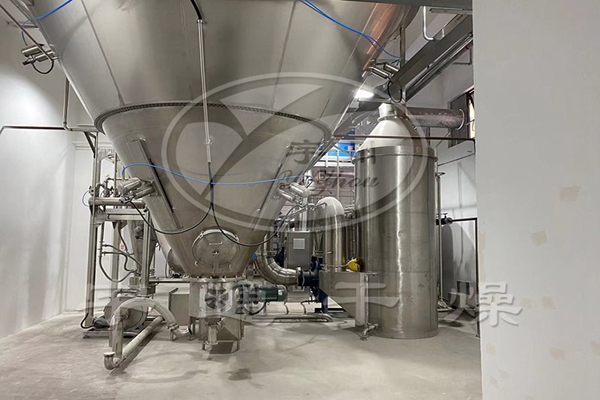 空气经空气过滤器后进入空气加热器,当空气加热器到给定的温度后以切线方向进入热风分配器,经热风分配器作用后的空气,均匀地、螺旋式地进入干燥室,同时料液由雾化器雾化为20-60um的雾滴,当雾滴与热空气接触后就迅速汽化干燥为粉末或颗粒产品。采用旋风风离器直接收集后经气力输送至效料仓,完成物料的冷却及输送,废气由风机排出口经水沫除尘器排出。